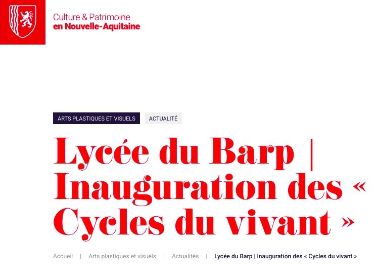 Inauguration of Cycles du vivant, the 1% artistic project at Le Barp secondary school, attended by artists Camille Beauplan, Céline Domengie, Christophe Doucet, Marie Sirgue and Cocktail, accompanied by the associations Zébra 3 and Pointdefuite. Presentation of the work of Céline Domengie, Kônôpéion.